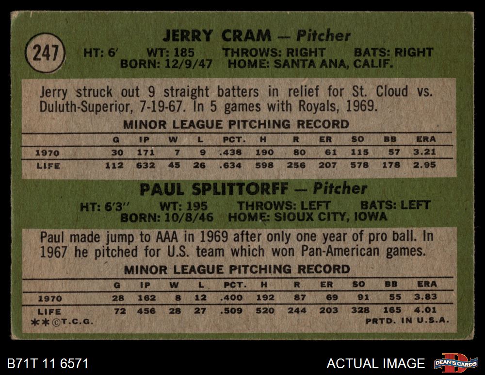 1971 Topps #247 - Paul Splittorff / Jerry Cram Royals Rookies 3 - VG