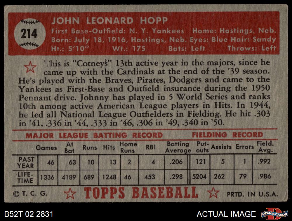 1952 Topps #214 Johnny Hopp