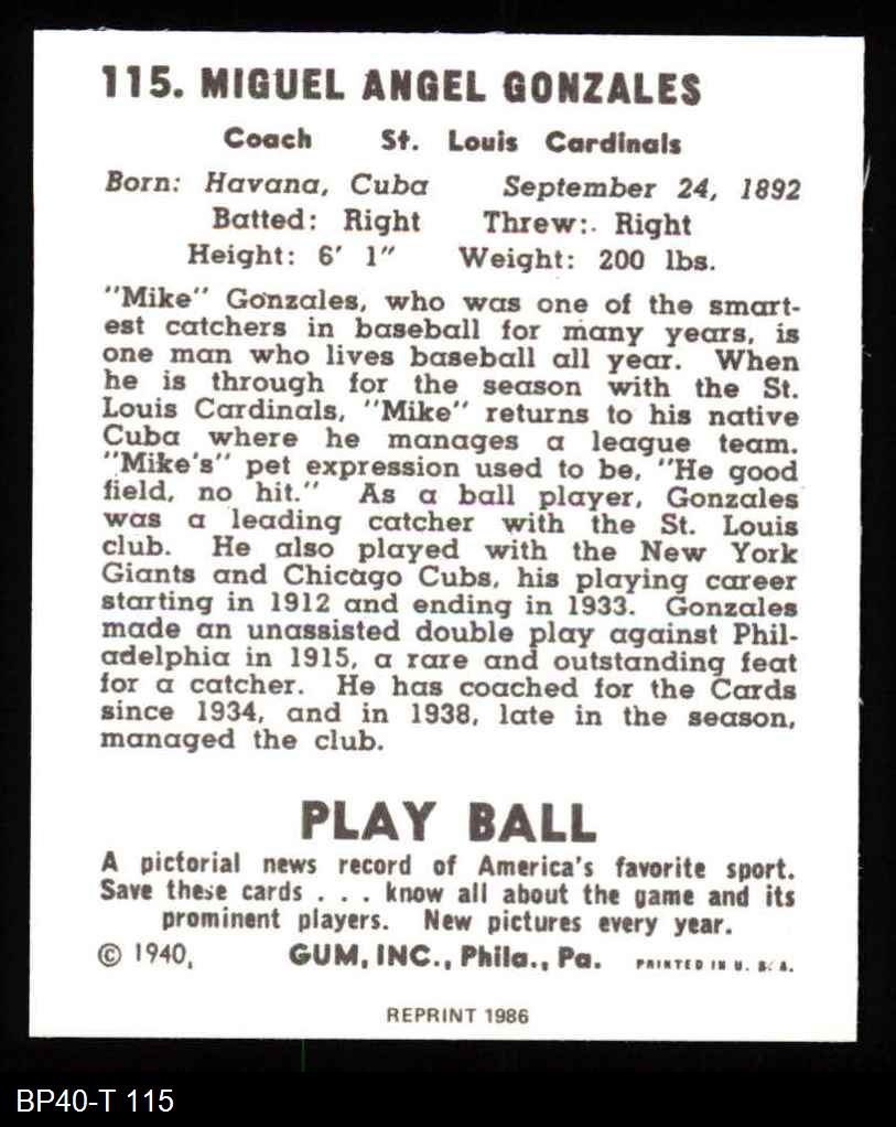 1940 Play Ball Reprint #115 Mike Gonzalez