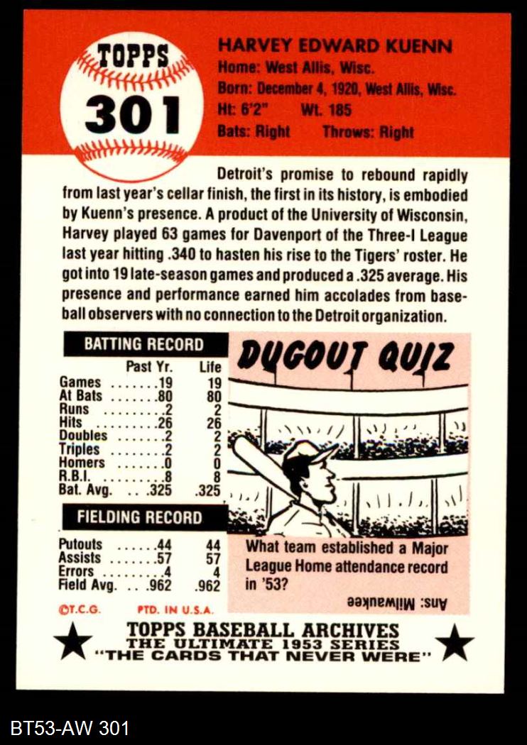 1953 Topps Archives #301 Harvey Kuenn