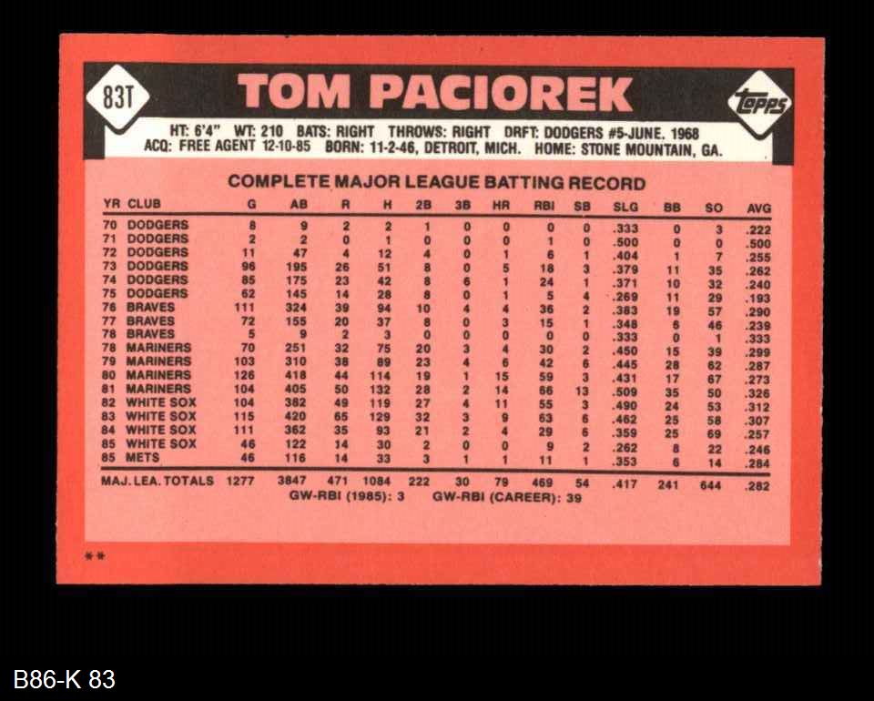 1986 Topps Traded #83 T Tom Paciorek 8 - NM/MT