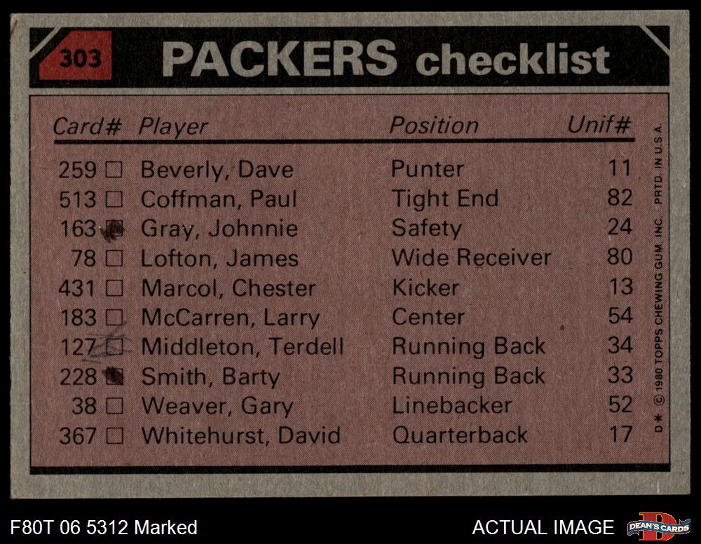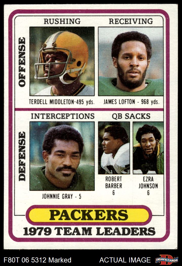 1980 Topps #303  -  Terdell Middleton / James Lofton / Johnnie Gray / Robert Barber / Ezra Johnson Packers Leaders & Checklist Front Thumbnail