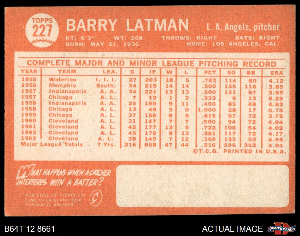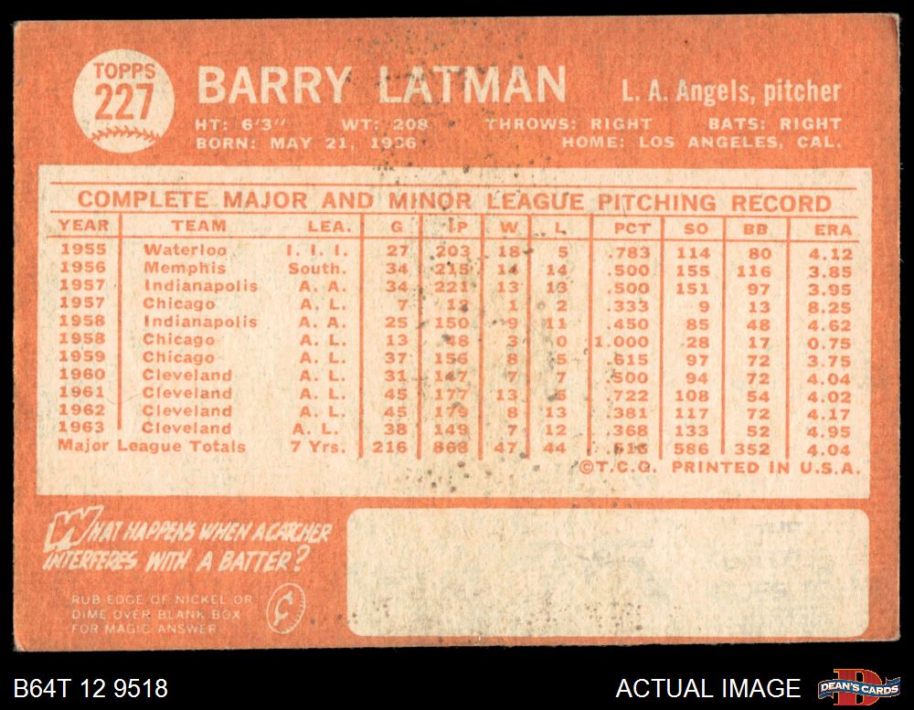 1964 Topps #227 Barry Latman 2 - GOOD
