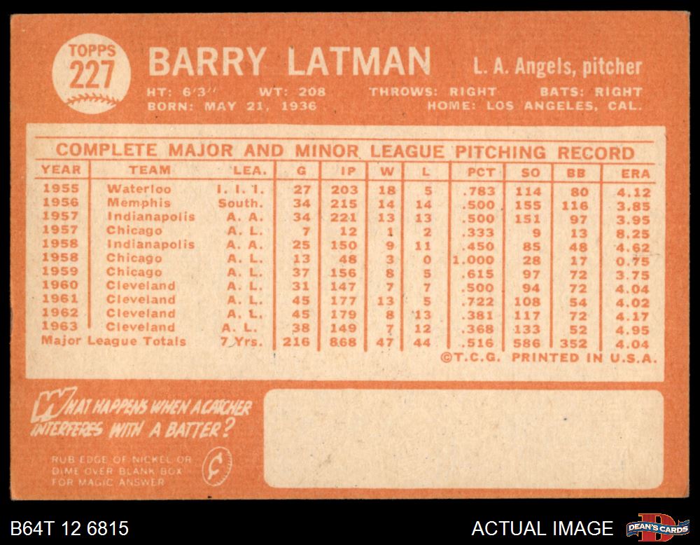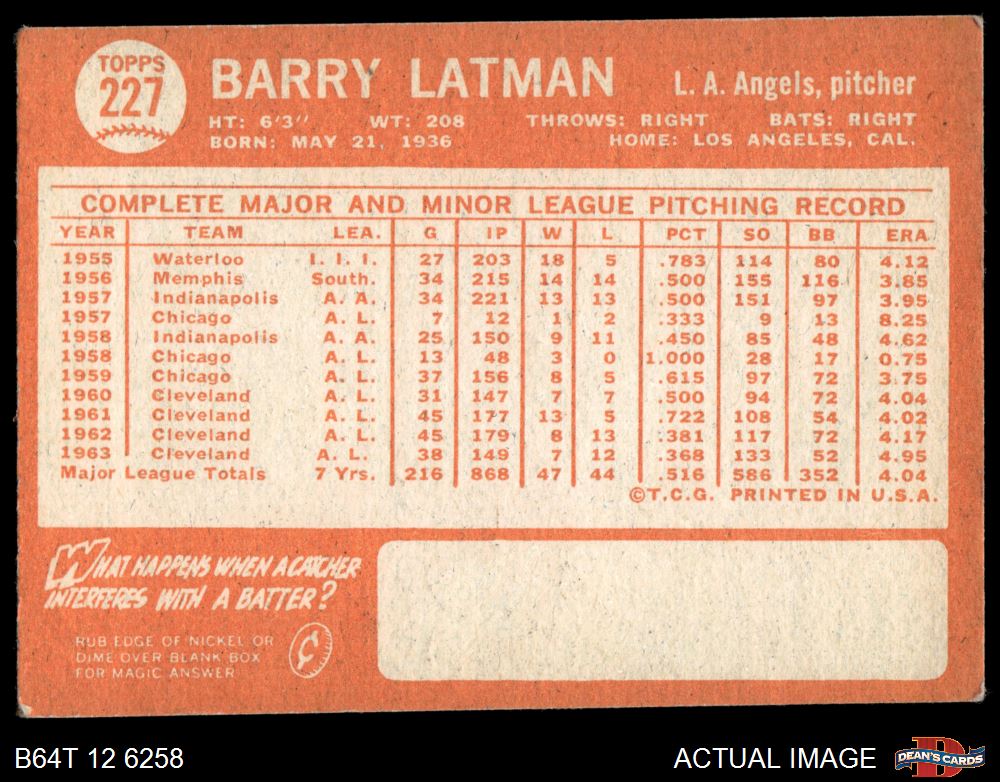 1964 Topps #227 Barry Latman 3 - VG