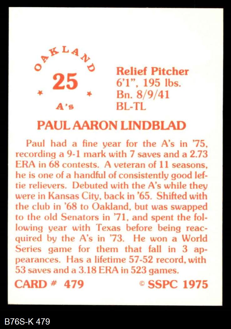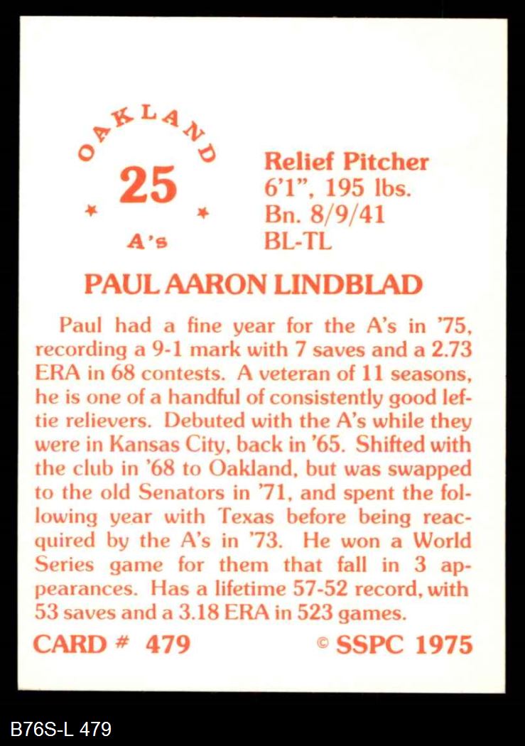 1975 SSPC #479 Paul Lindblad
