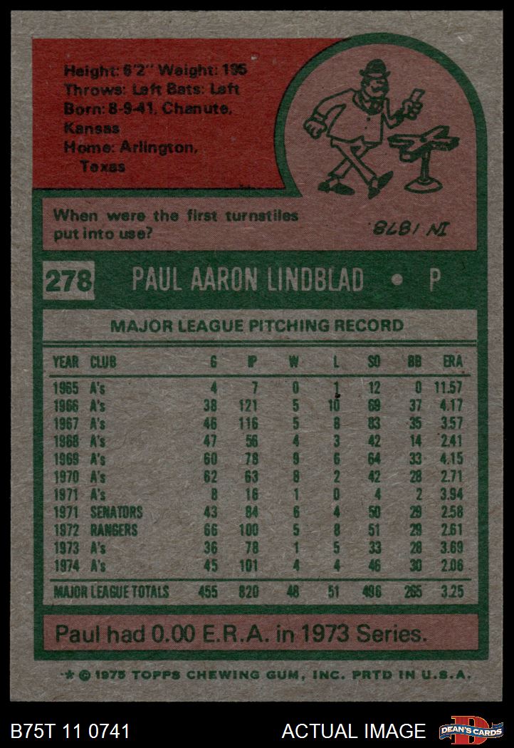 1975 Topps #278 Paul Lindblad 6.5 - EX/MT+