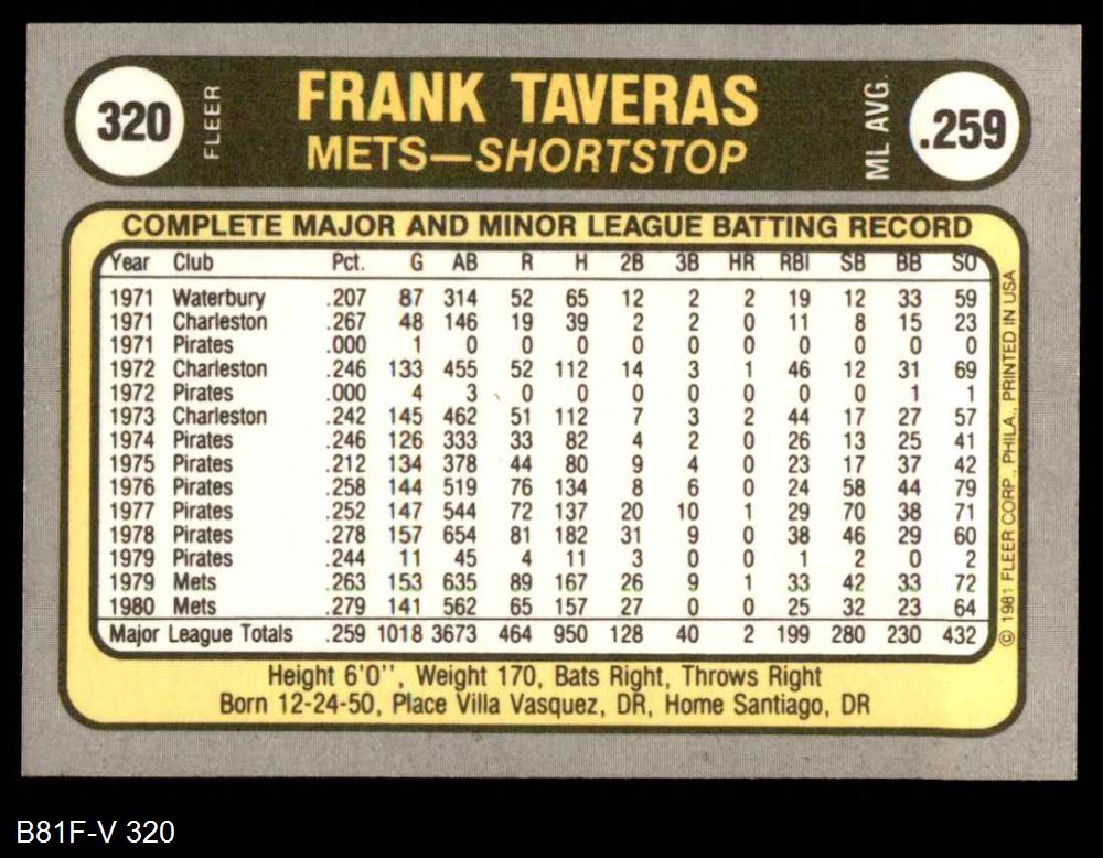 1981 Fleer #320 Frank Taveras 8 - NM/MT