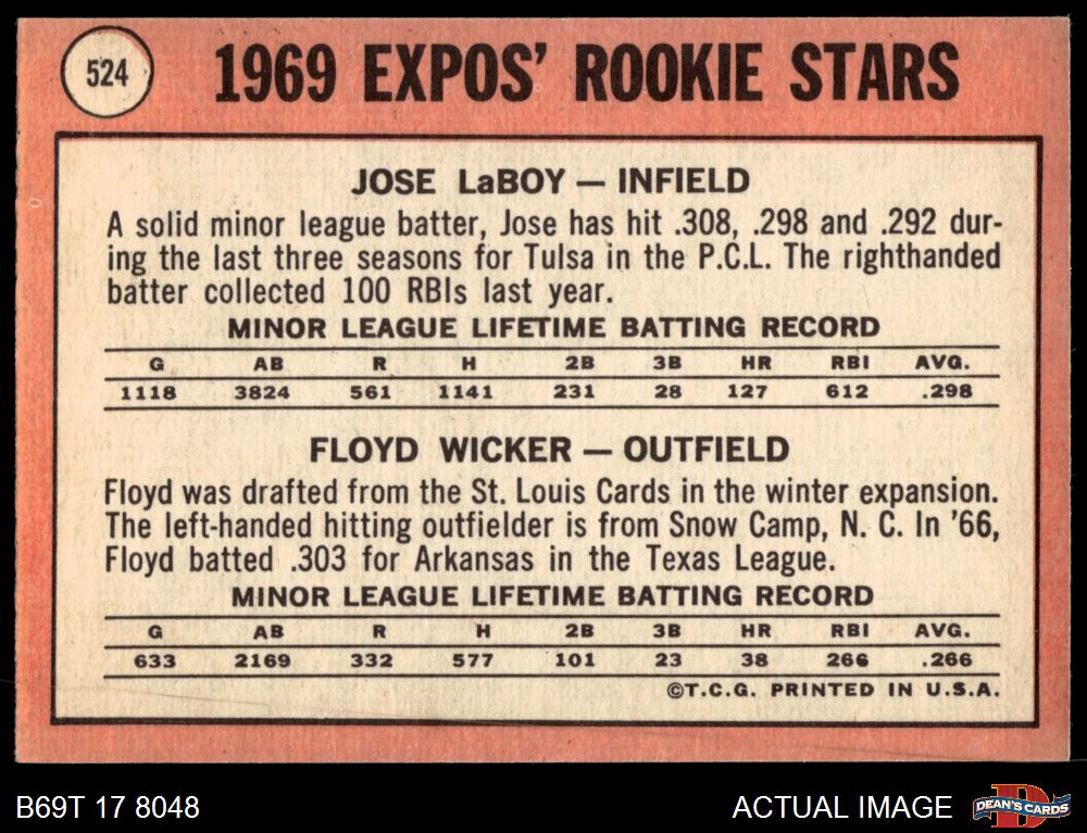 1969 Topps #524 - Jose Laboy / Floyd Wicker Expos Rookies 5 - EX
