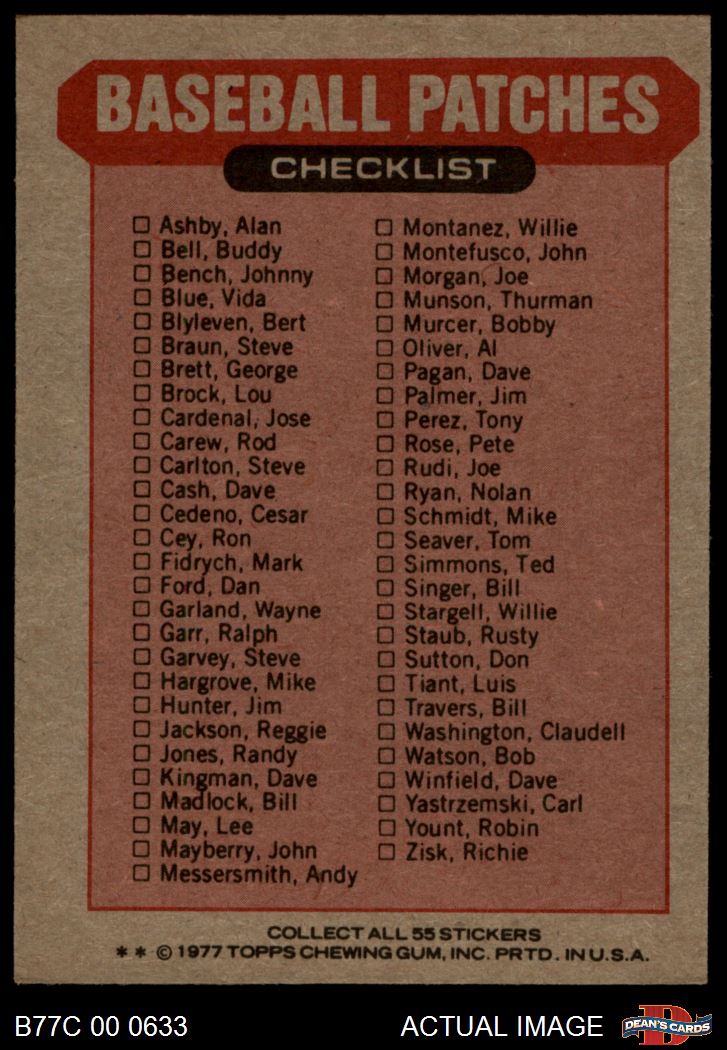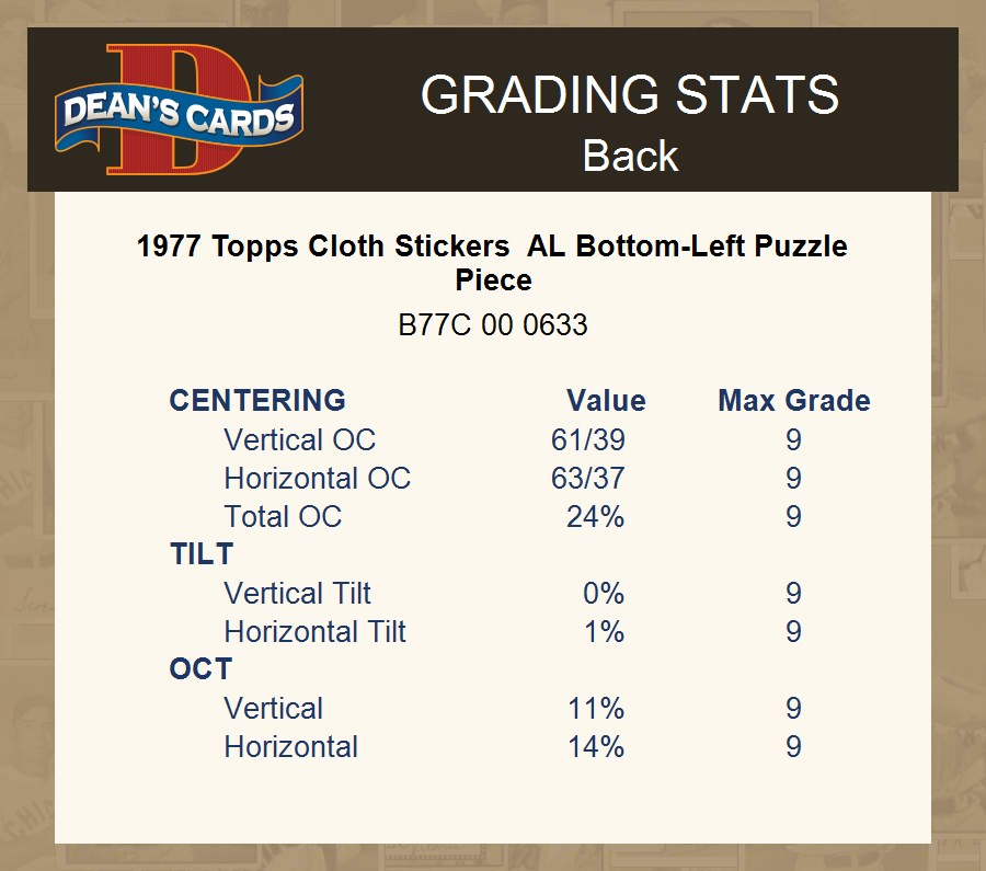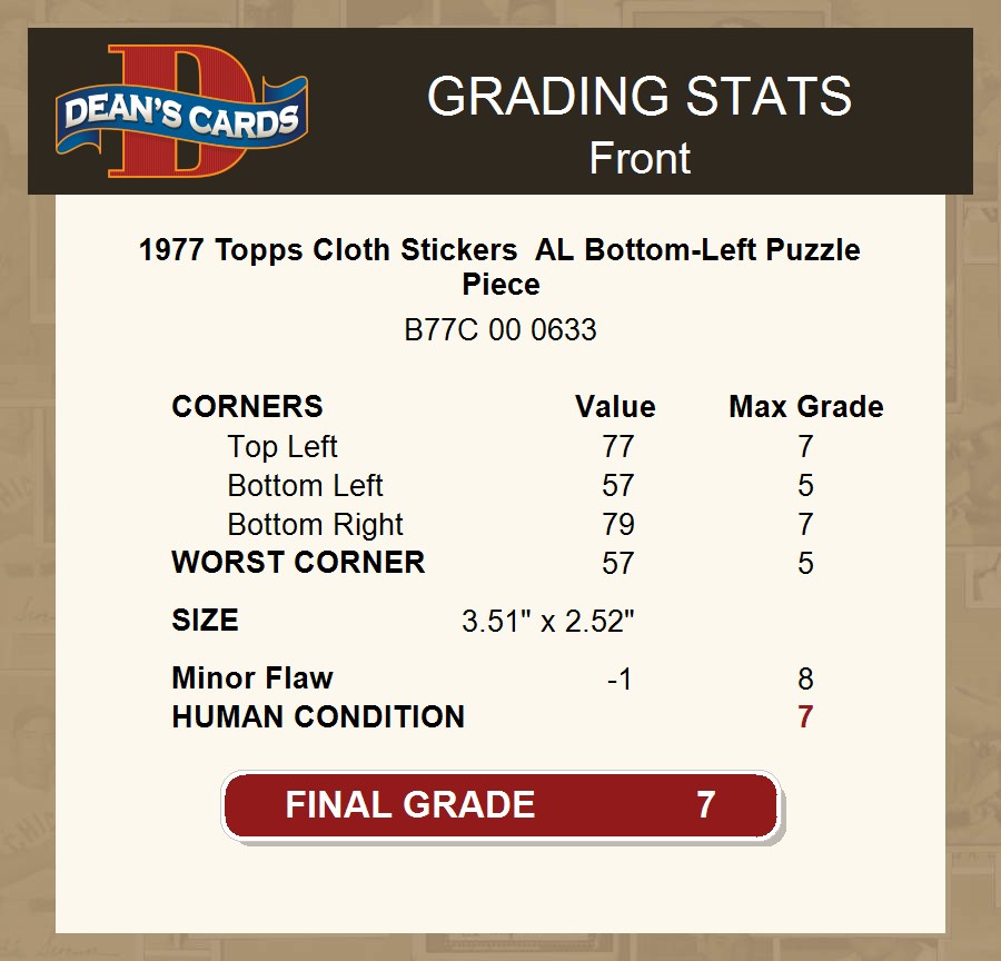 1977 Topps Cloth Stickers AL Bottom-Left Puzzle Piece 7 - NM