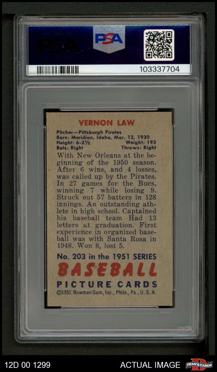 1951 Bowman #203 Vern Law PSA 4 - VG/EX
