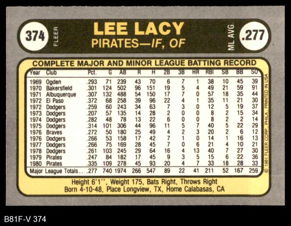 1981 Fleer #374 Lee Lacy 8 - NM/MT