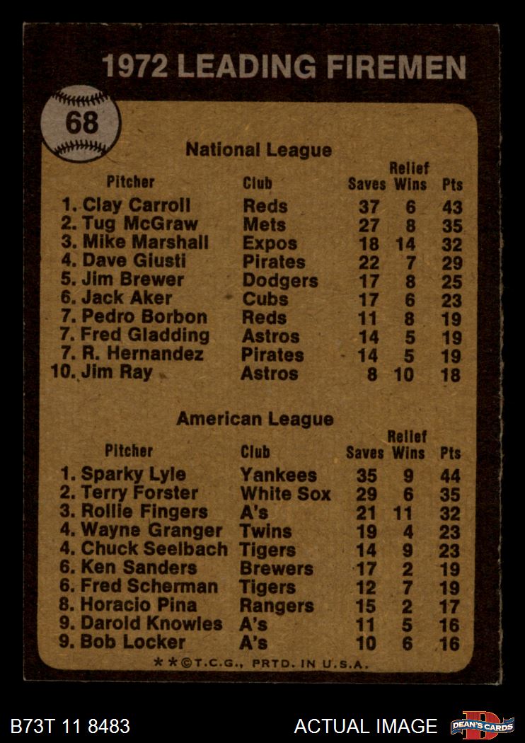 1973 Topps #68 - Clay Carroll / Sparky Lyle Leading Firemen 3 - VG