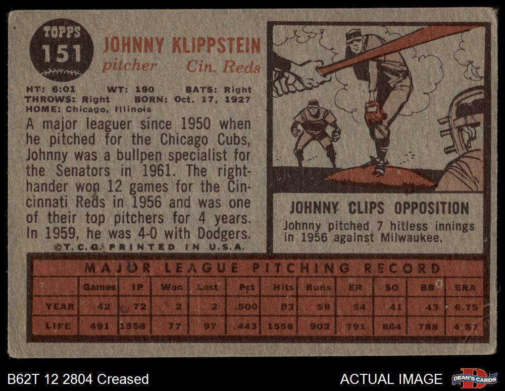 1962 Topps #151 GRN Johnny Klippstein