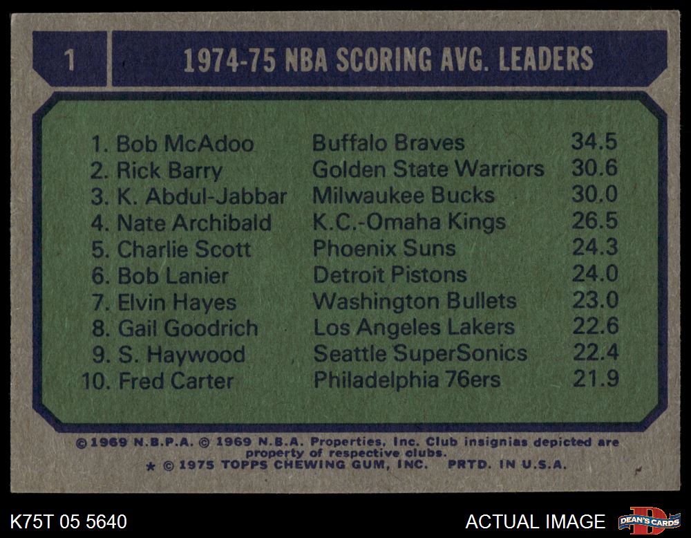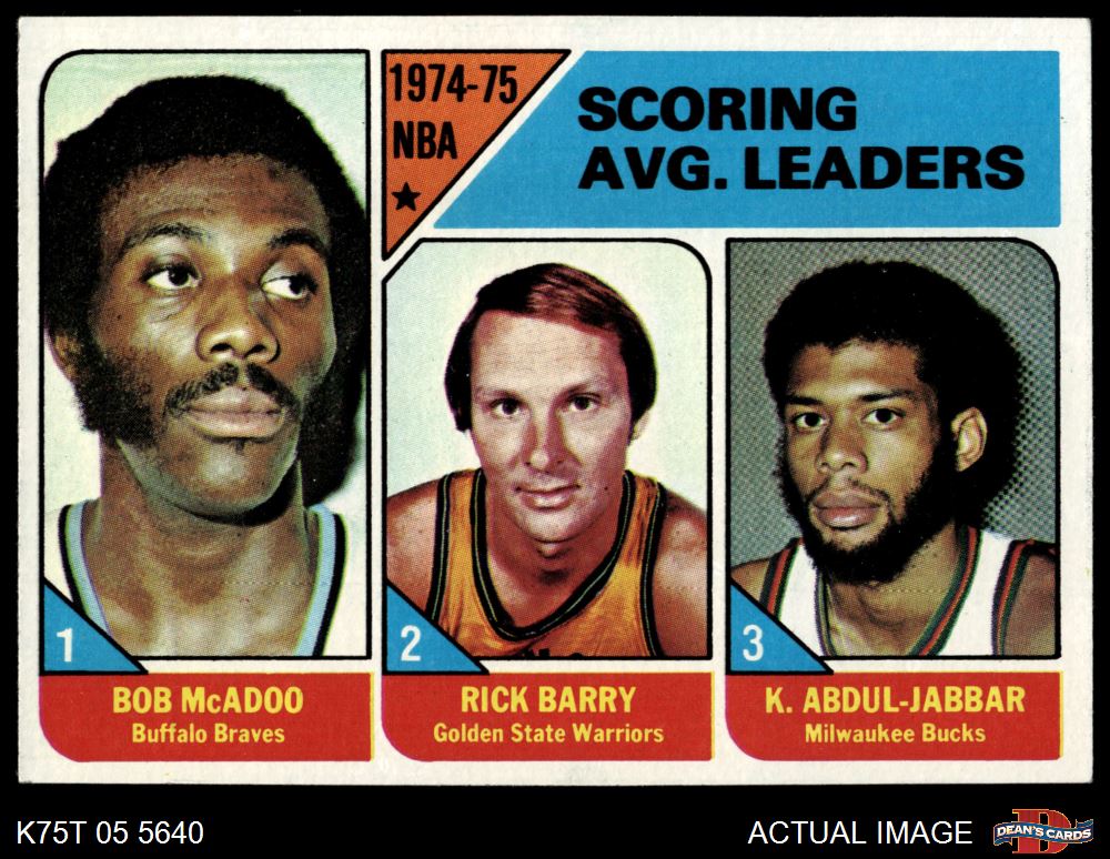 1975 Topps #1 - Kareem Abdul-Jabbar / Rick Barry / Bob McAdoo NBA Scoring Average Leaders 7 - NM