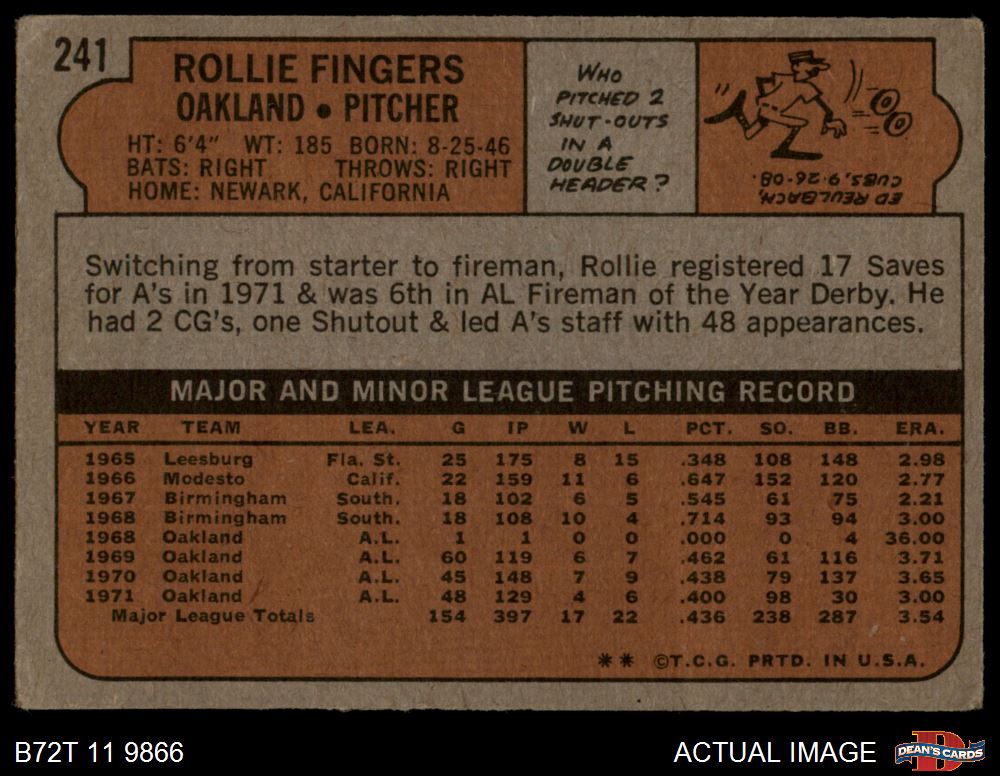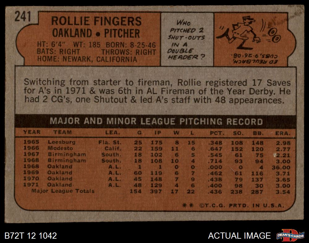 1972 Topps #241 Rollie Fingers 2 - GOOD