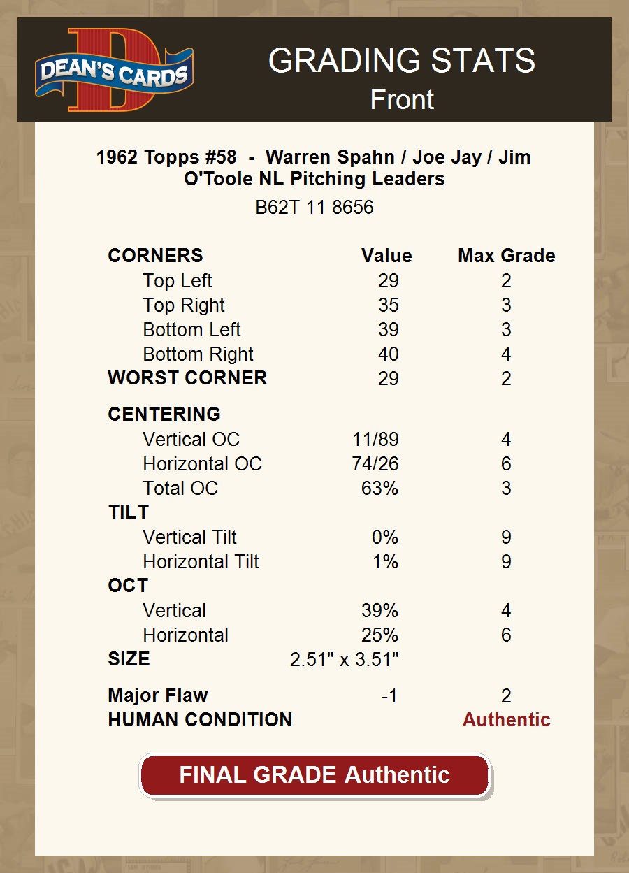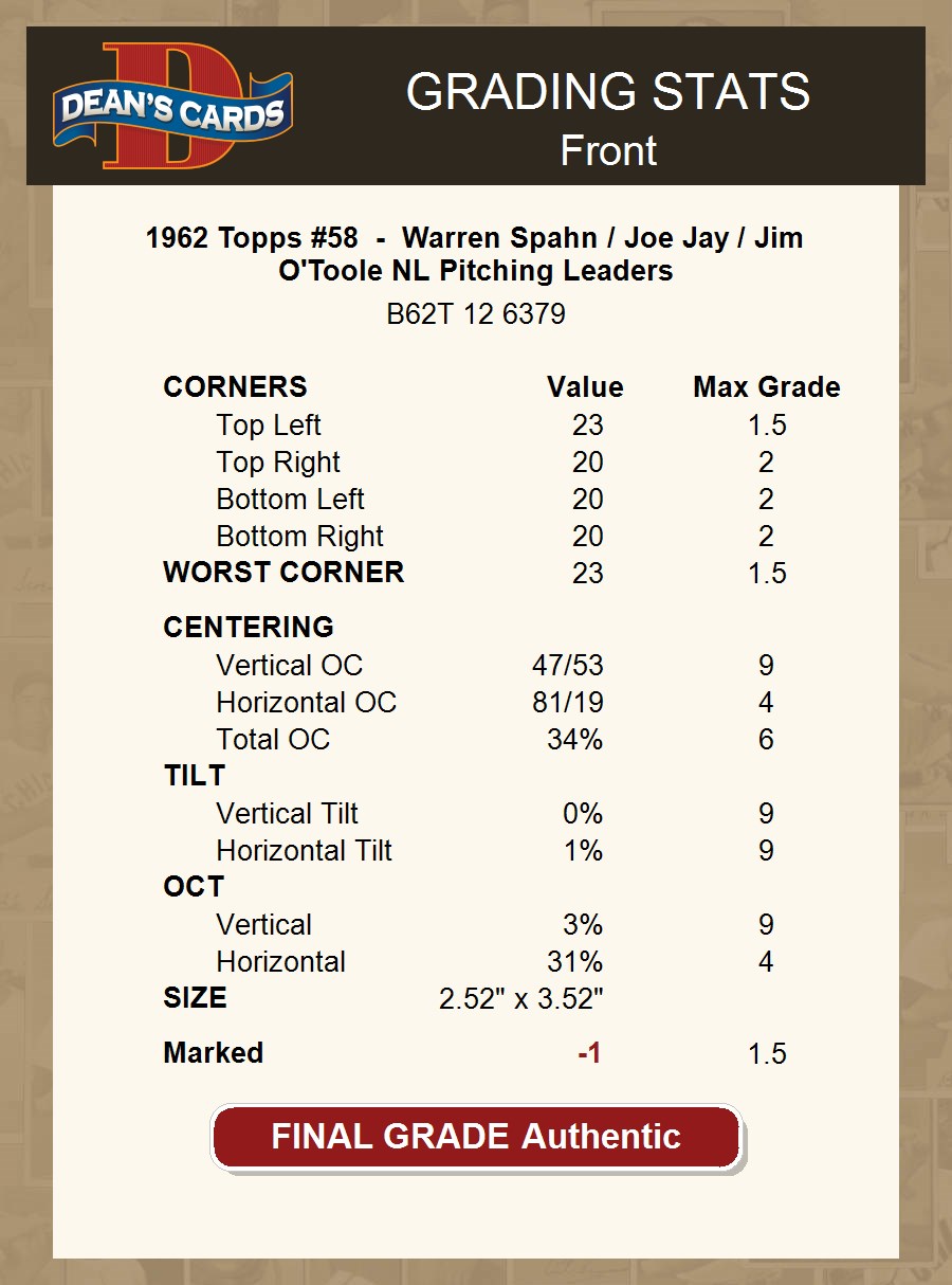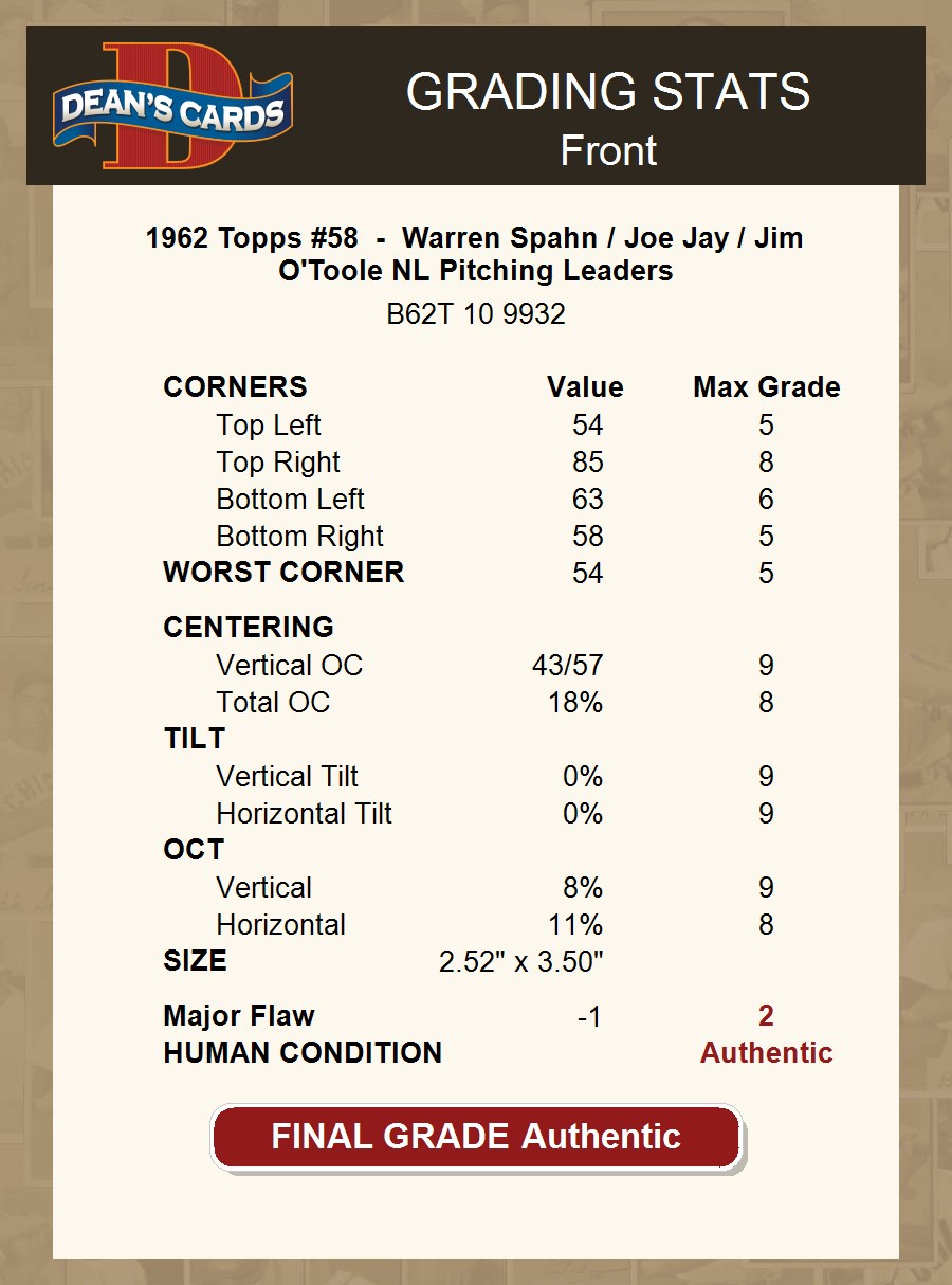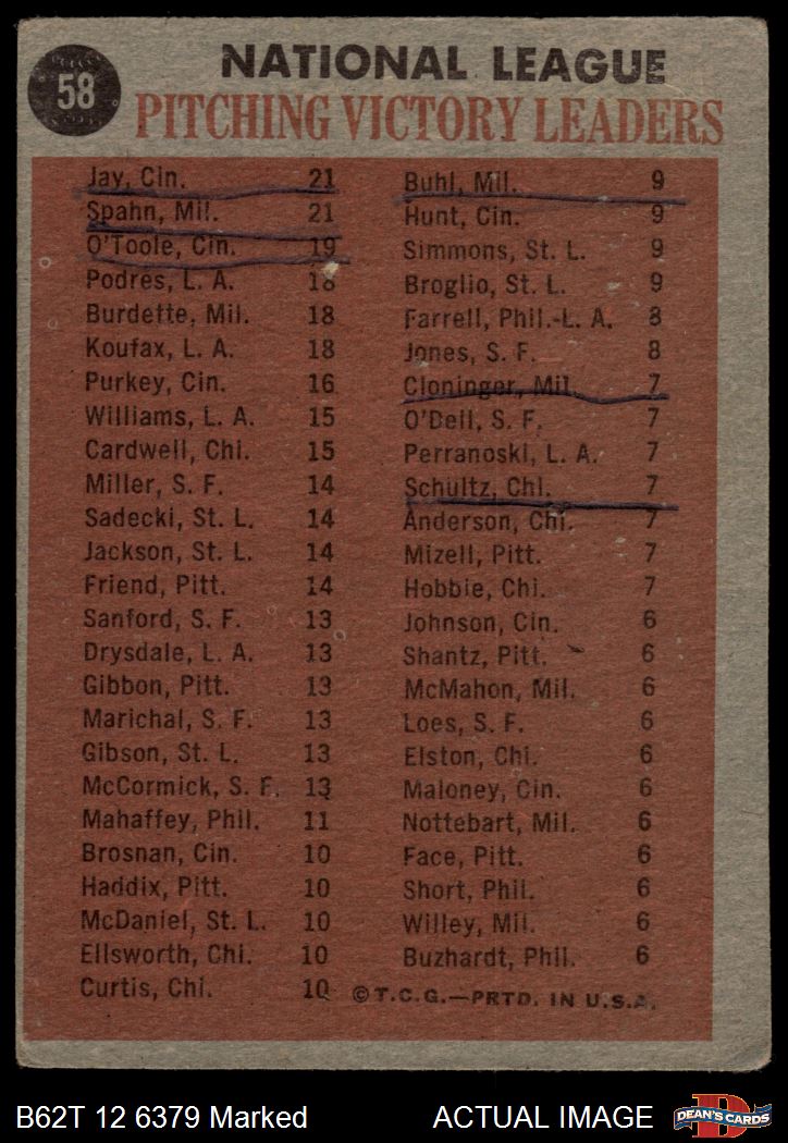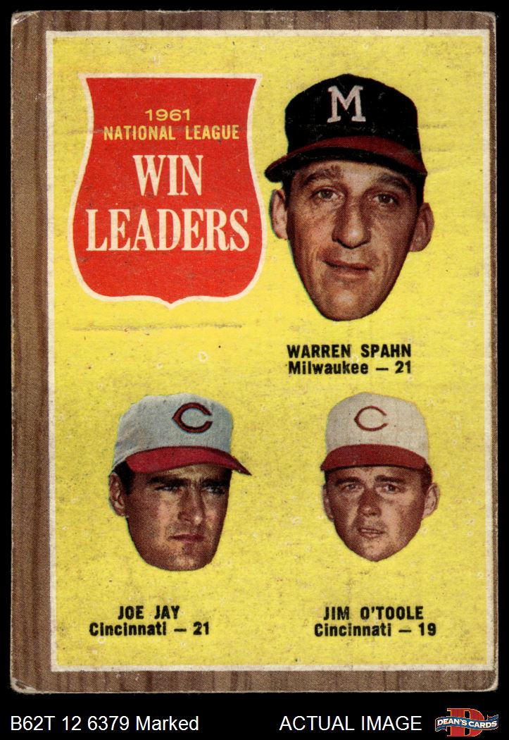 1962 Topps #58 - Warren Spahn / Joe Jay / Jim O'Toole NL Pitching Leaders AUTHENTIC