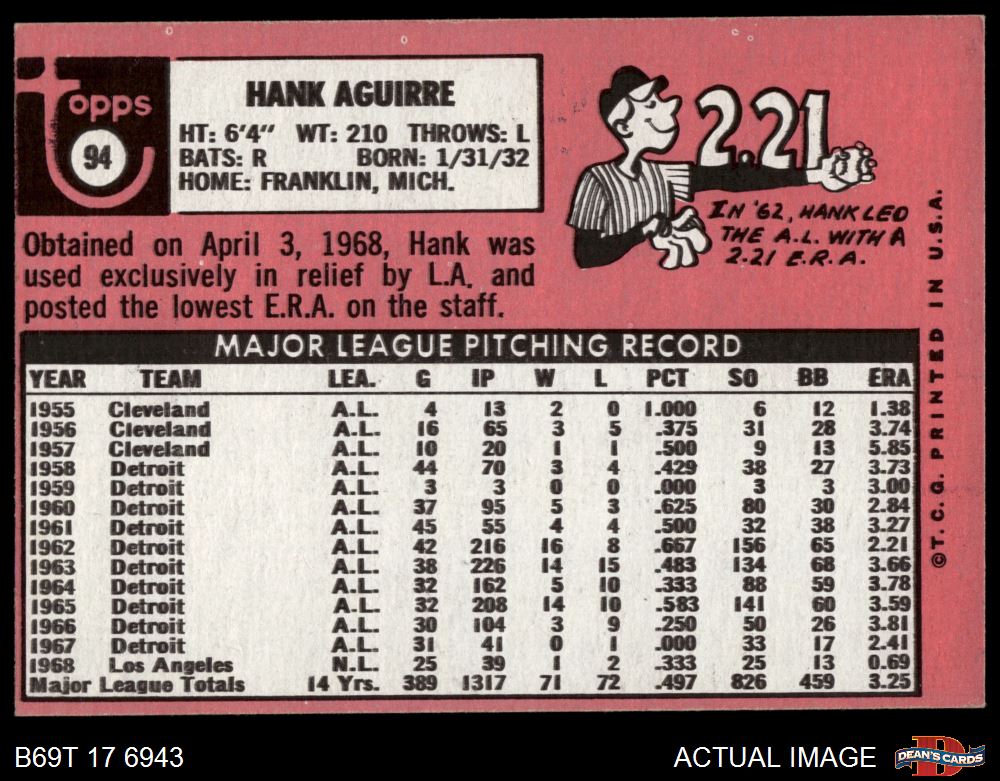 1969 Topps #94 Hank Aguirre 4 - VG/EX
