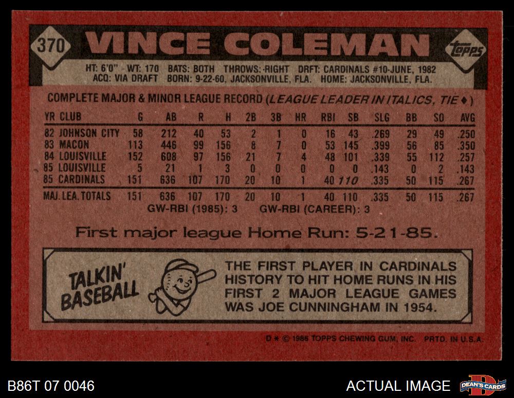 1986 Topps #370 Vince Coleman 8 - NM/MT