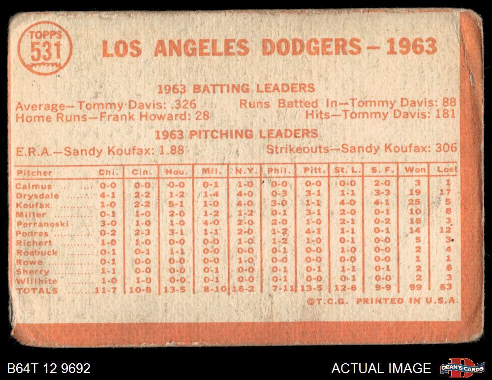 1964 Topps #531 Dodgers Team AUTHENTIC