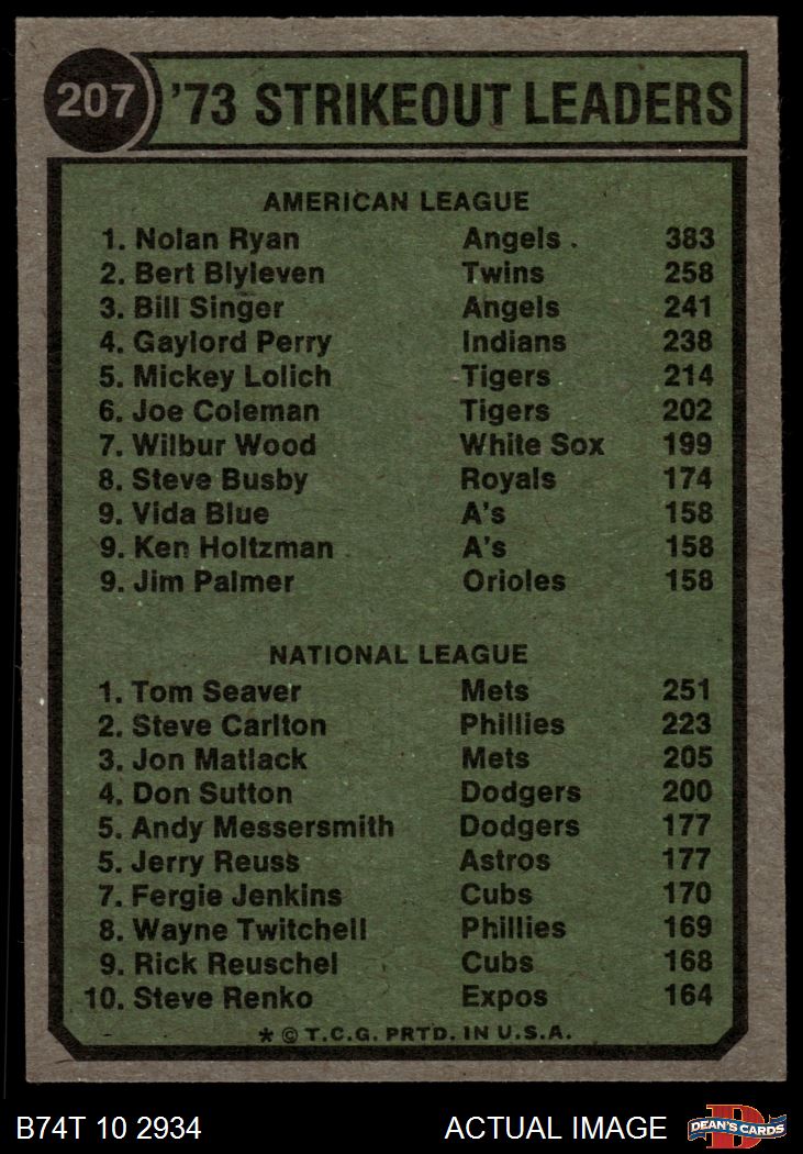 1974 Topps #207 - Nolan Ryan / Tom Seaver Strikeout Leaders 5 - EX
