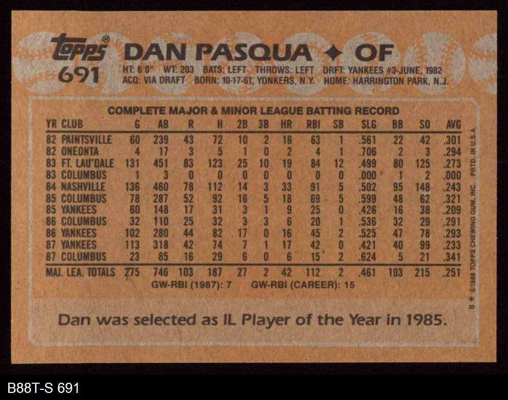 1988 Topps #691 Dan Pasqua 8 - NM/MT