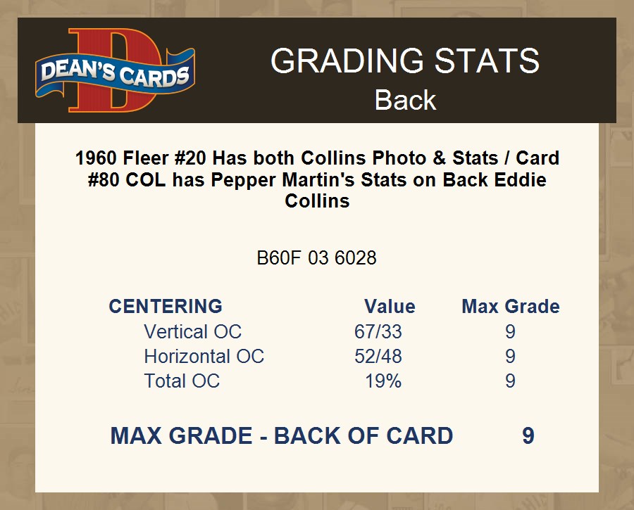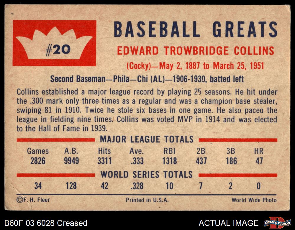 1960 Fleer #20 Has both Collins Photo & Stats / Card #80 COL has Pepper Martin's Stats on Back Eddie Collins 2 - GOOD