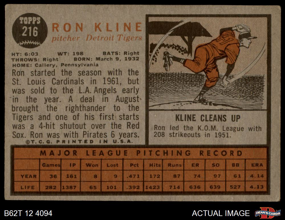 1962 Topps #216 Ron Kline 4 - VG/EX