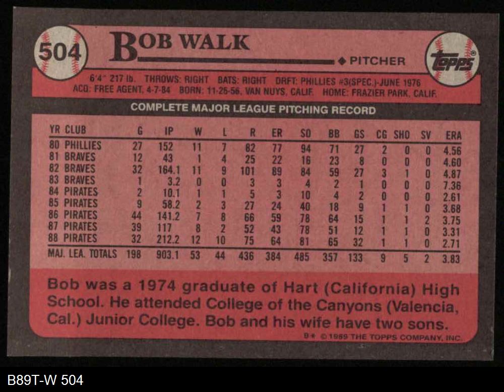 1989 Topps #504 Bob Walk 8 - NM/MT