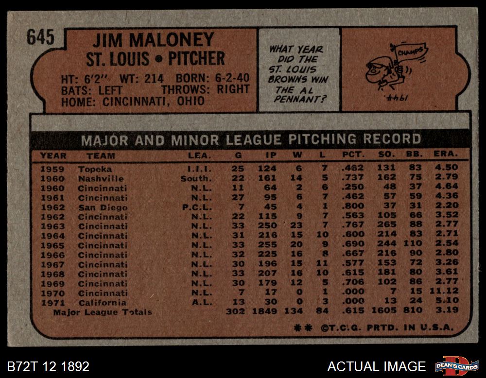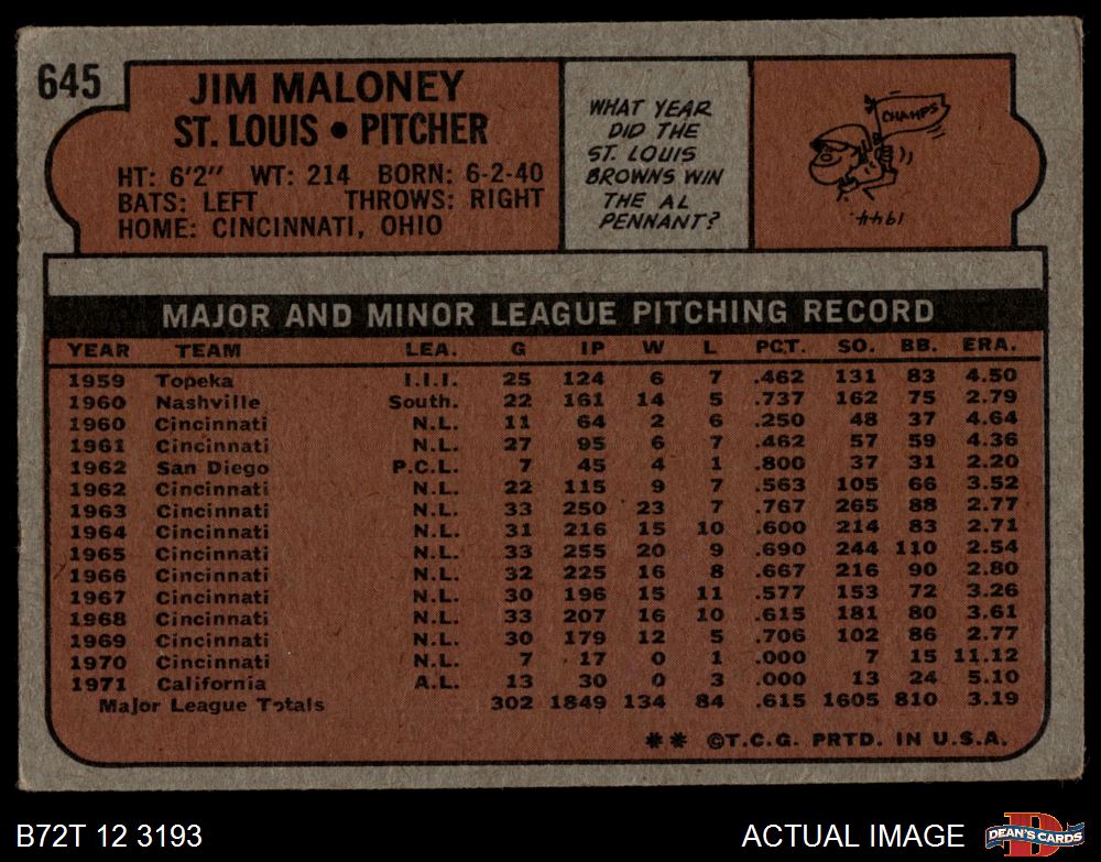1972 Topps #645 Jim Maloney