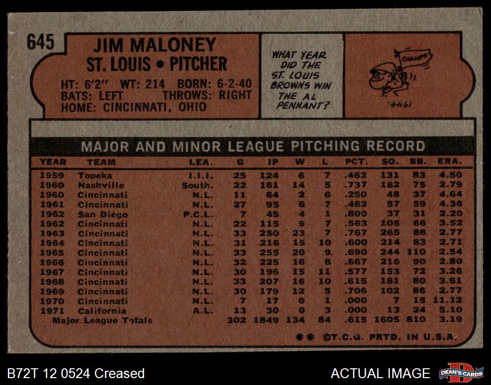 1972 Topps #645 Jim Maloney Front Thumbnail