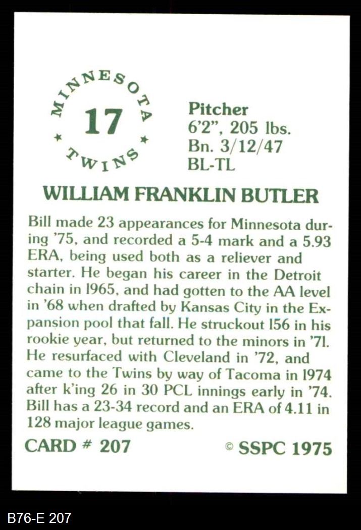 1975 SSPC #207 Bill Butler 8 - NM/MT