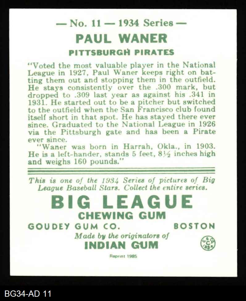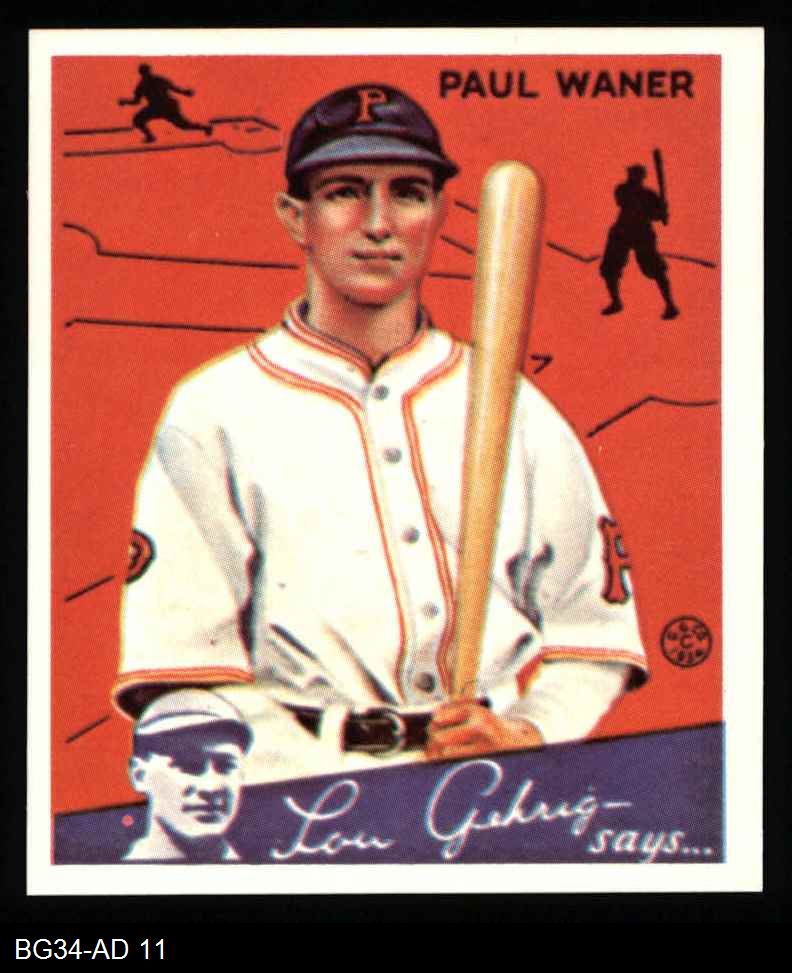 1934 Goudey Reprint #11 Paul Waner 8 - NM/MT