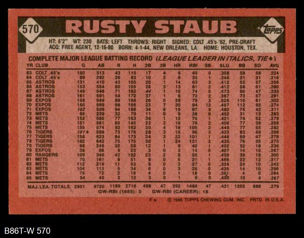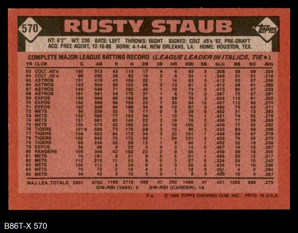1986 Topps #570 Rusty Staub 8 - NM/MT