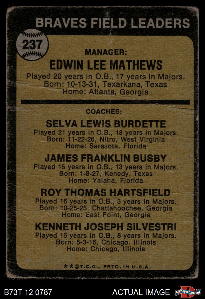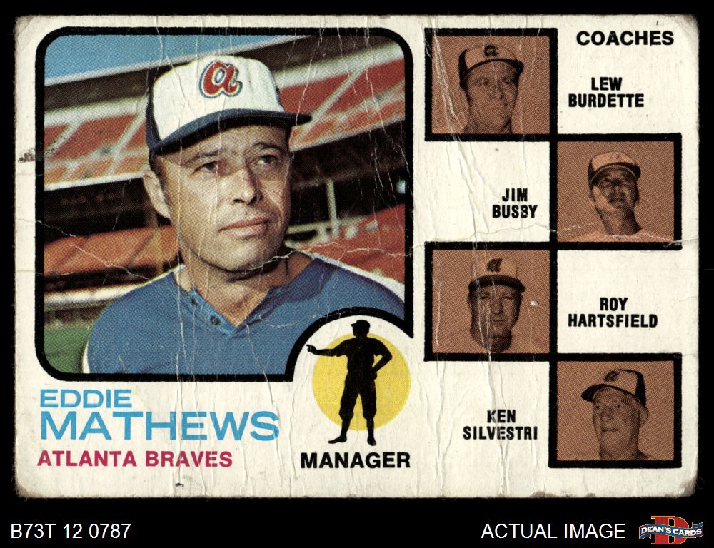 1973 Topps #237 EAR - Eddie Mathews / Lew Burdette / Jim Busby / Roy Hartsfield / Ken Silvestri Braves Leaders AUTHENTIC