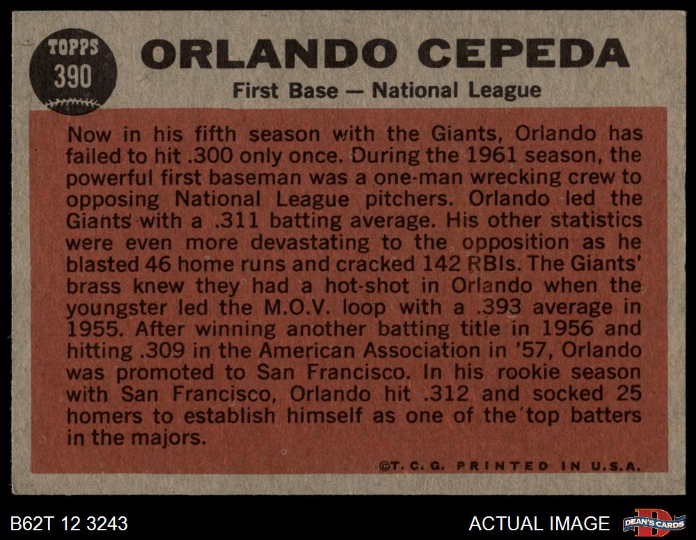 1962 Topps #390 - Orlando Cepeda All-Star 5 - EX