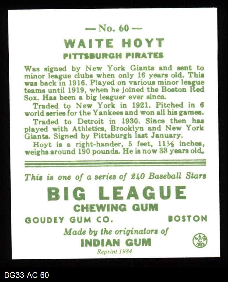 1933 Goudey Reprint #60 Waite Hoyt 8 - NM/MT