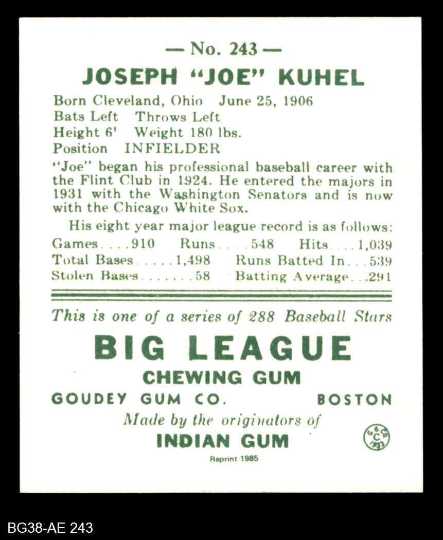 1938 Goudey Heads-Up Reprint #243 Joe Kuhel