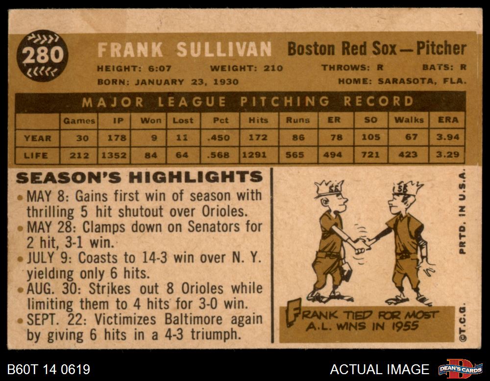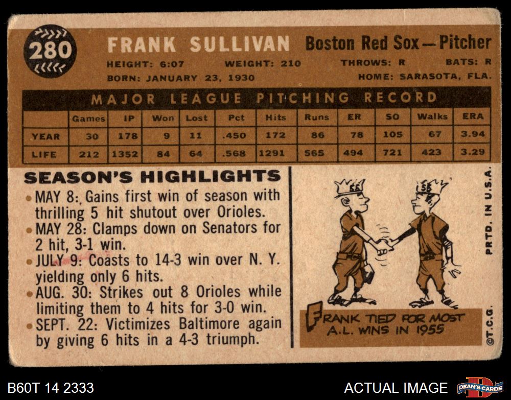 1960 Topps #280 Frank Sullivan 1.5 - FAIR