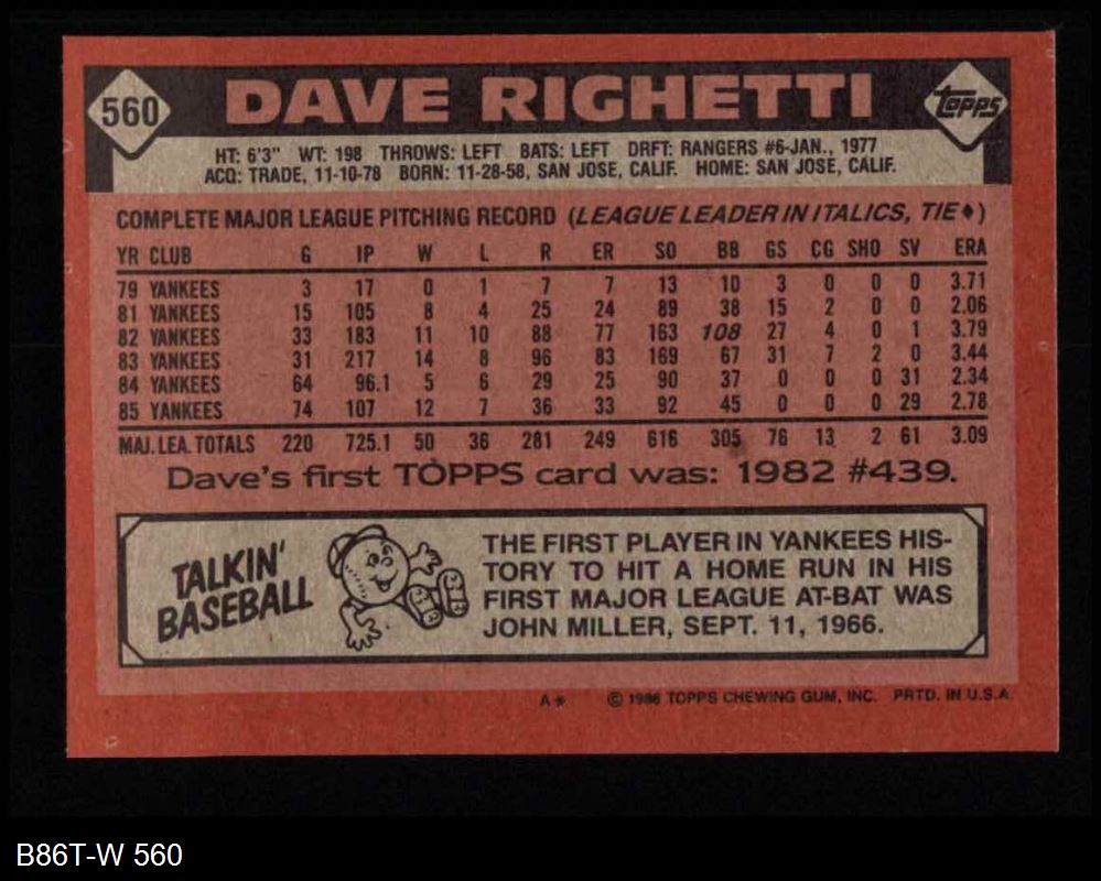 1986 Topps #560 Dave Righetti 8 - NM/MT