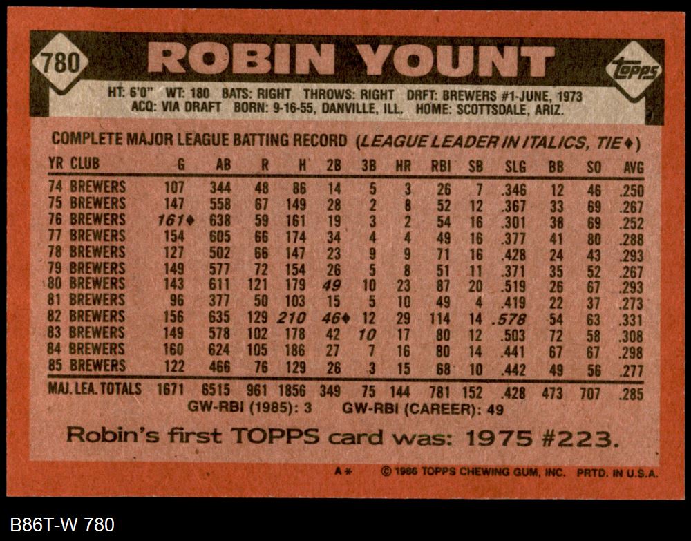 1986 Topps #780 Robin Yount