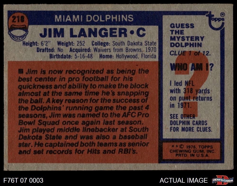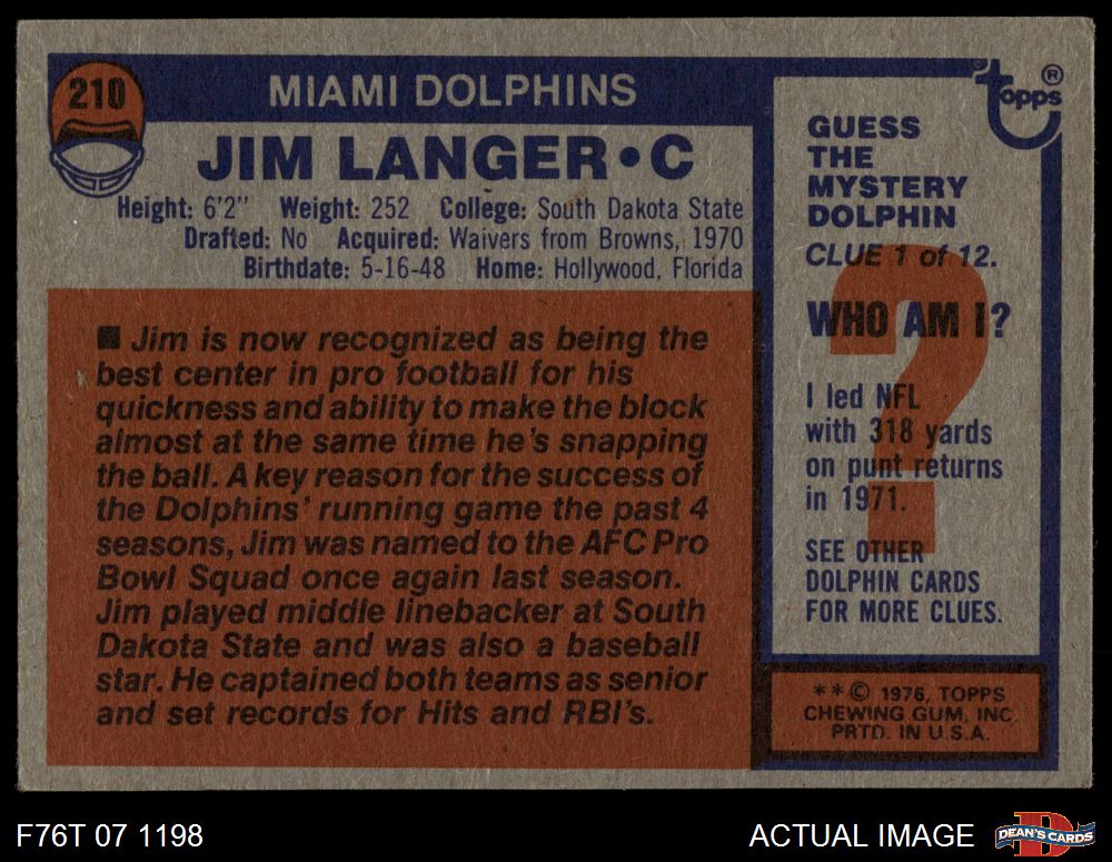 1976 Topps #210 Jim Langer 3 - VG