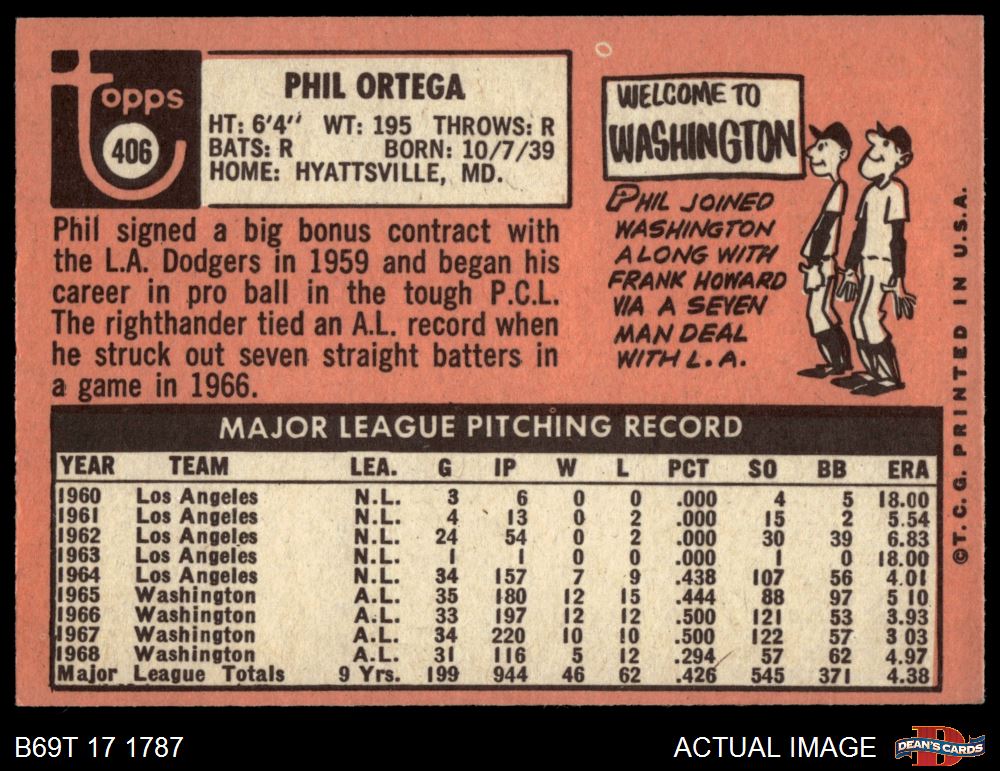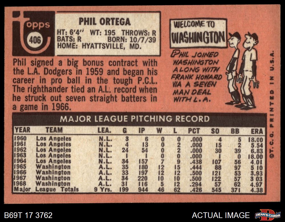 1969 Topps #406 Phil Ortega 4 - VG/EX