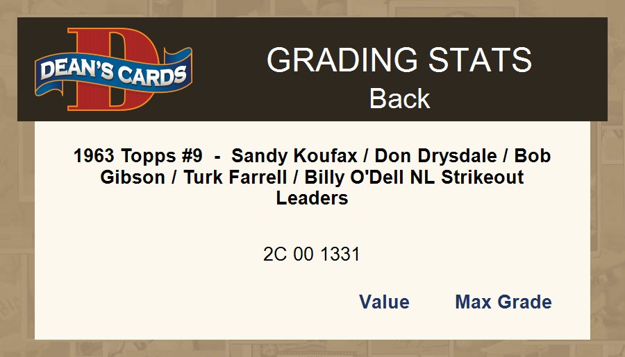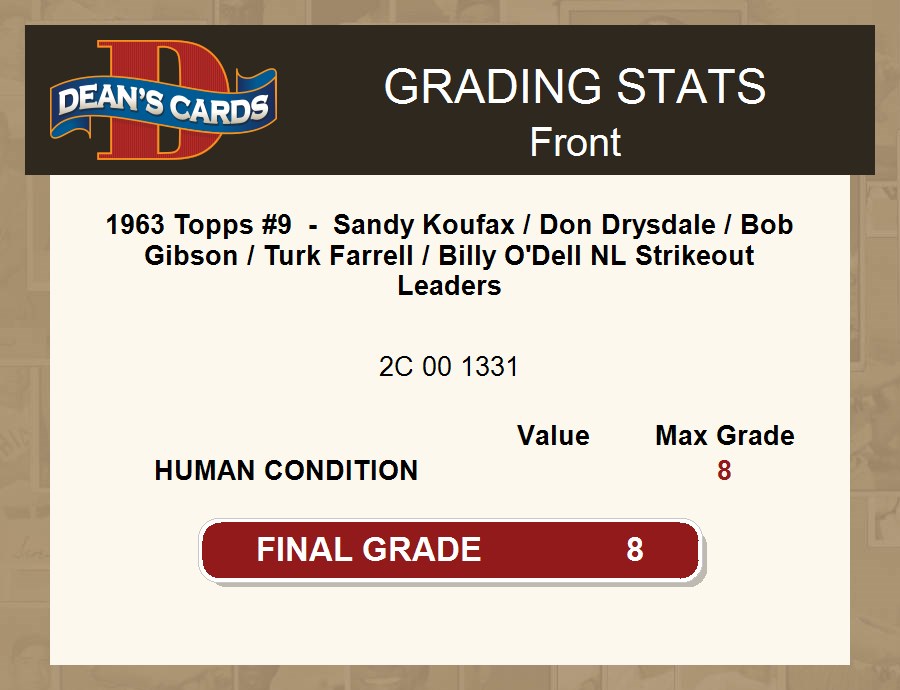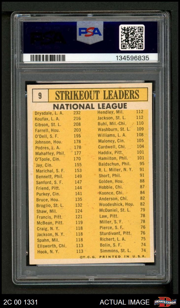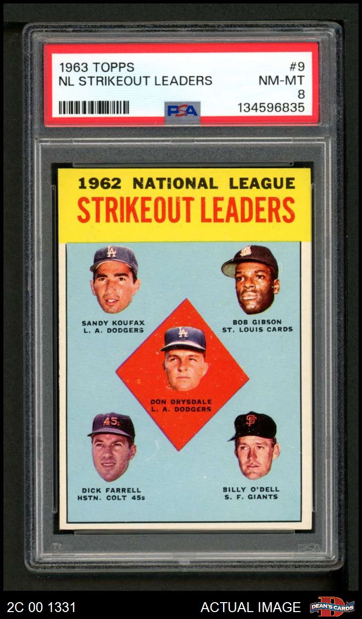 1963 Topps #9 - Sandy Koufax / Don Drysdale / Bob Gibson / Turk Farrell / Billy O'Dell NL Strikeout Leaders PSA 8 - NM/MT