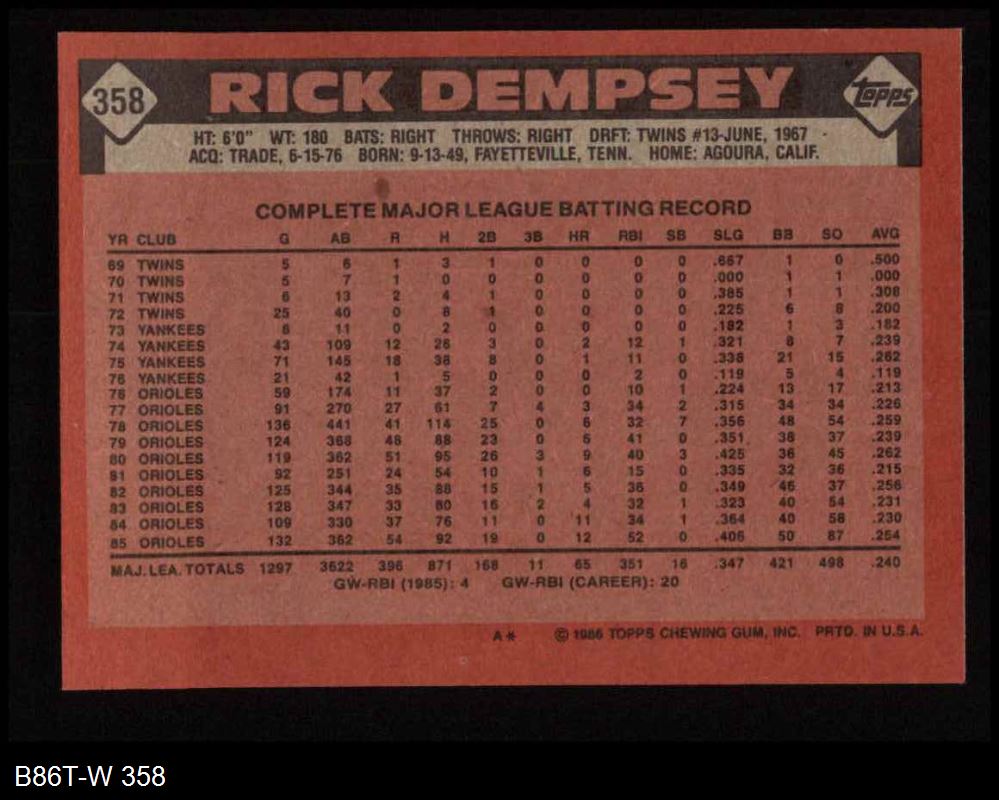 1986 Topps #358 Rick Dempsey 8 - NM/MT