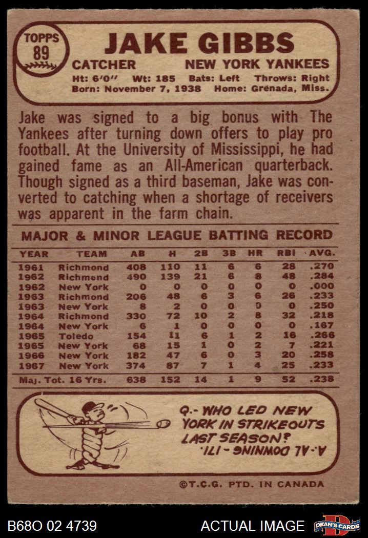 1968 O-Pee-Chee #89 Jake Gibbs 4 - VG/EX