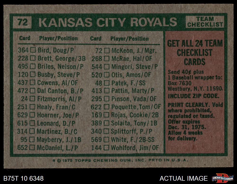 1975 Topps #72 - Jack McKeon Royals Team Checklist 6 - EX/MT