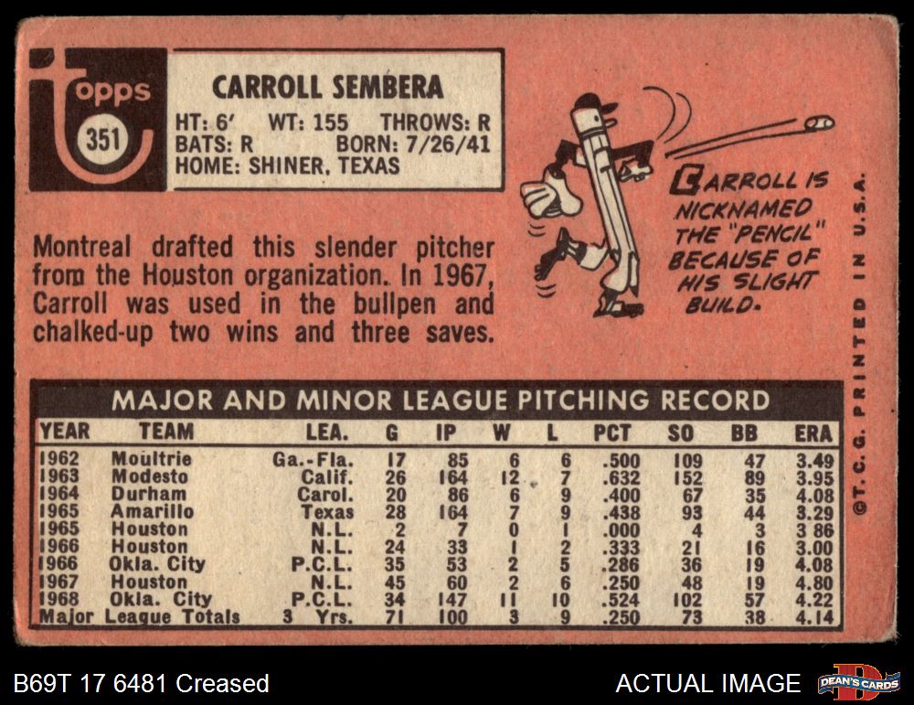 1969 Topps #351 Carroll Sembera 1 - POOR