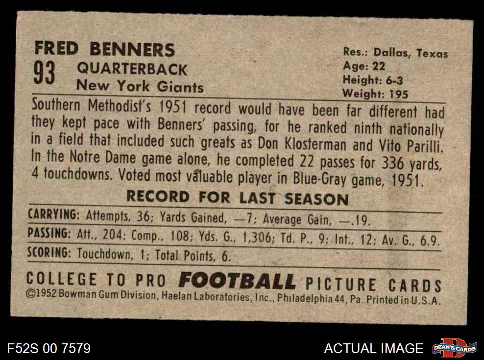 1952 Bowman Small #93 Fred Benners 5 - EX