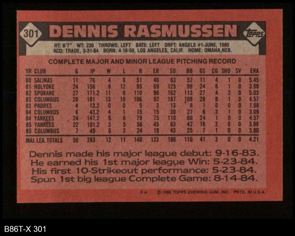 1986 Topps #301 Dennis Rasmussen