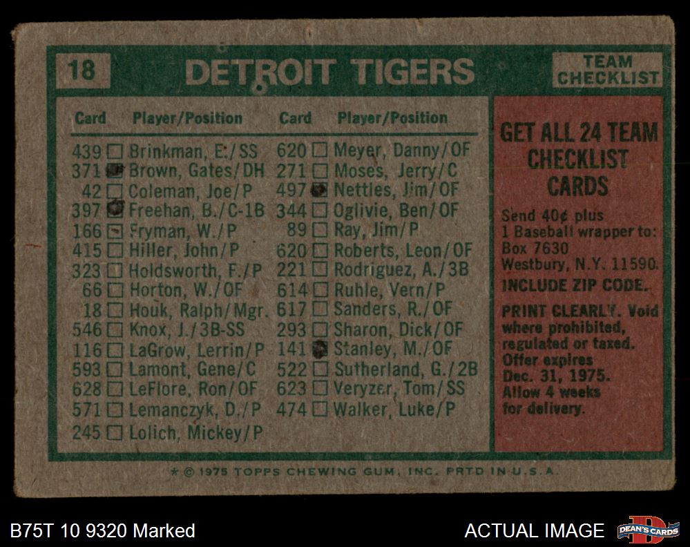 1975 Topps #18 - Ralph Houk Tigers Team Checklist 1 - POOR